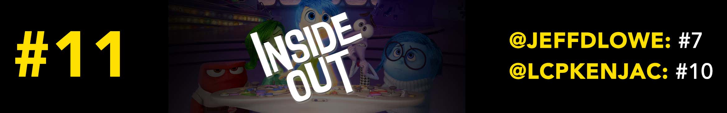 KenJac (His Rank: 10): It was pretty incredible what they were able to do in this movie as far as conceptualizing emotions into tangible characters. The voice cast brought this movie to another level as well.
