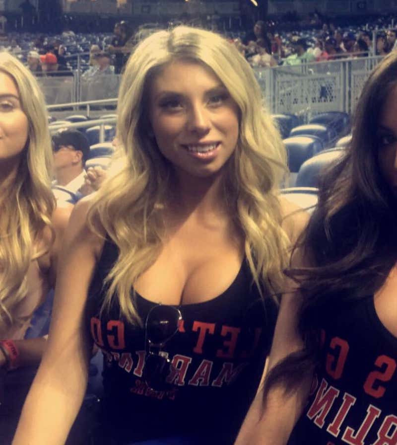 *Terann Hillow enters the chat*. Terann hasn’t dumped ‘em out and let ‘em breath at a baseball game, but has been a distraction behind home plate nonetheless just by being, ya know, insanely attractive. Huge Astros fan too as you can see.