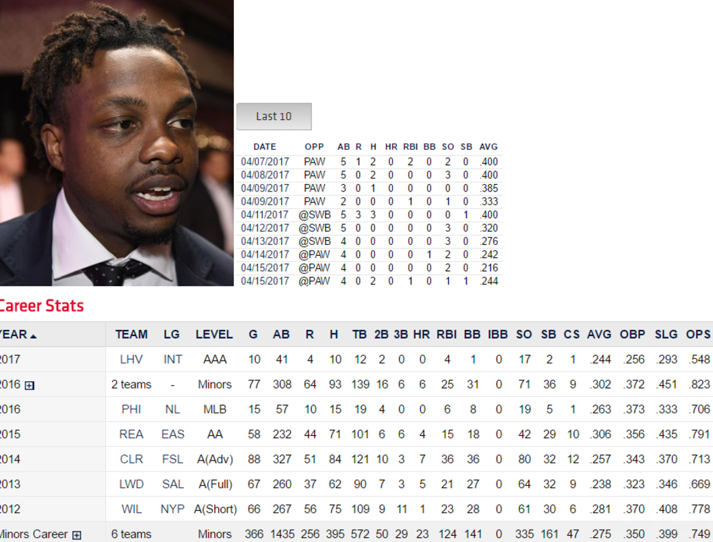 I love this kid. A switch hitter who has lightening speed and can make things happen on the ball field. He impressed during his call up last September and he certainly caught mine and few other folks attention this Spring. He hasn’t had the best start in AAA this season, but I think all the Phillies need to see out of him at his point is health. Can he stay on the ball field through July without any setbacks and if so, then the ceiling is the roof. He needs to adopt a more Juan Pierre style of hitting, slapping the ball and using his speed. I think that will be the best fit for him in the future. Because when this guy is on the base paths, watch out.