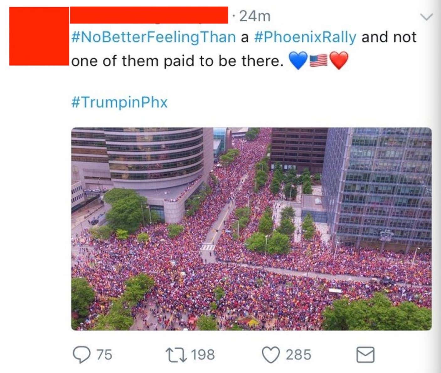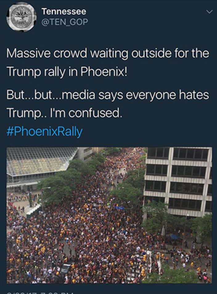One of the beauties of the fake news phenomenon is people out there now trying to get away with ANYTHING. And succeeding! I mean look at this very simple example. Some jabroni googles crowd pictures, finds one that looks infinite, tosses it online with some caption about Trump supporters in Phoenix and voila, that’s EXACTLY what it becomes: