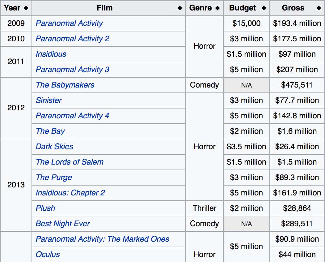 Now, in regards to my headline on this blog, I believe IT can change the landscape of modern mainstream horror movies, with a little help from Get Out. The current trend in Hollywood is to make mindless low-budget horror movies with enough jump scares for a decent trailer. Then they dump a few million dollars into marketing, and viola, RIDICULOUS profit. It’s a formula that works over and over and over, with no signs of slowing down. One Reddit user pointed out that Blumhouse Productions has it down to a science. I mean, look at this shit: